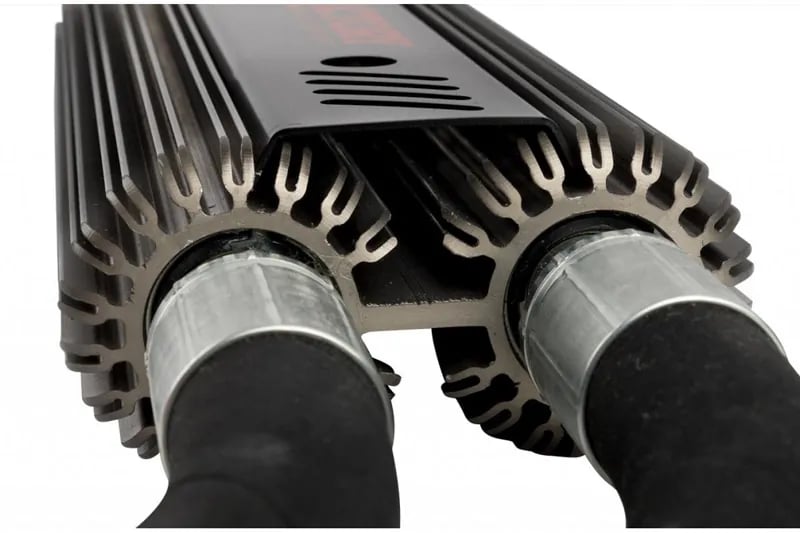 - Features finned, remote reservoirs with dual hoses