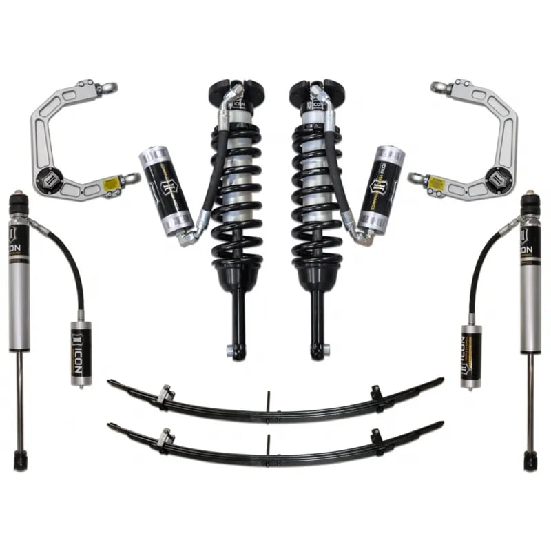 There’s no where better to turn for high quality suspension systems than ICON. The Stage 4 Leveling Kit for the 2005 to 2022 Toyota Tacoma 4WD/PreRunner revolutionizes your midsize truck both on the street and out on the trail. ICON’s Stage 4 Tacoma suspension system is fully adjustable kit that can give you up to 2.75″ of front lift and can handle up to 2″ of rear lift which allows you to fit on impressive 33″ tires to turn your midsize ride to an aggressive warrior. ICON’s kit features a pair of awesome ICON remote reservoir coilover shocks for the front of your truck, a pair of ICON 2.0 Remote Reservoir Aluminum-body rear shocks, and two leaf springs, and two billet upper control arms to help give your truck excellent off-road performance while keeping your street ride smooth.