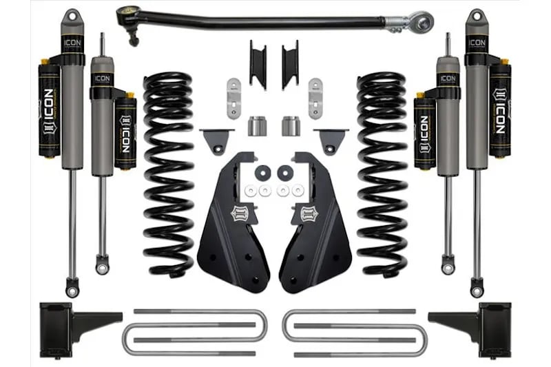 Lift your 2020-2022 F250 or F350 Super Duty and also improve ride quality and performance. This system is advertised by ICON as perfect for on-road and towing use as well as mild off-road use. The system itself is created with dual rate coil springs, alignment cams, and ICON 2.5 Aluminum Series front and rear shocks. Meant to help create a 25 percent increase in front wheel travel over stock, this kit features specific tuning that is perfect for your F250 or F350. The springs that come on this kit are rated for diesel trucks only and features an allotment for a softer initial rate that results in greater on road comfort, and a secondary rate that increases during compression for excellent bottoming resistance and off-road performance. This kit includes dual rate coil springs, radius arm drop brackets, adjustable track bar, 5″ block kit, and ICON 2.0 Aluminum Series front and rear shocks. The radius arm drop brackets in this kit help correct geometry and caster for optimal alignment specs.
