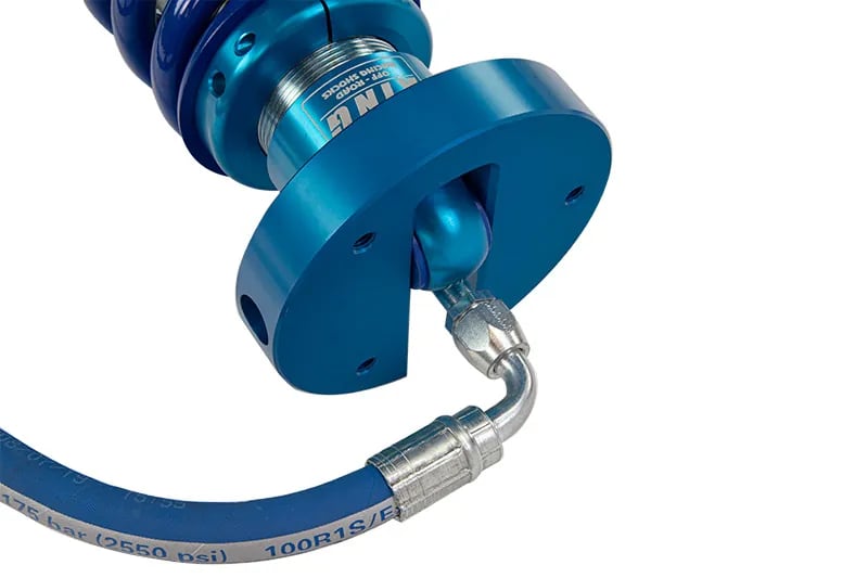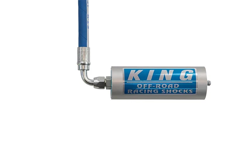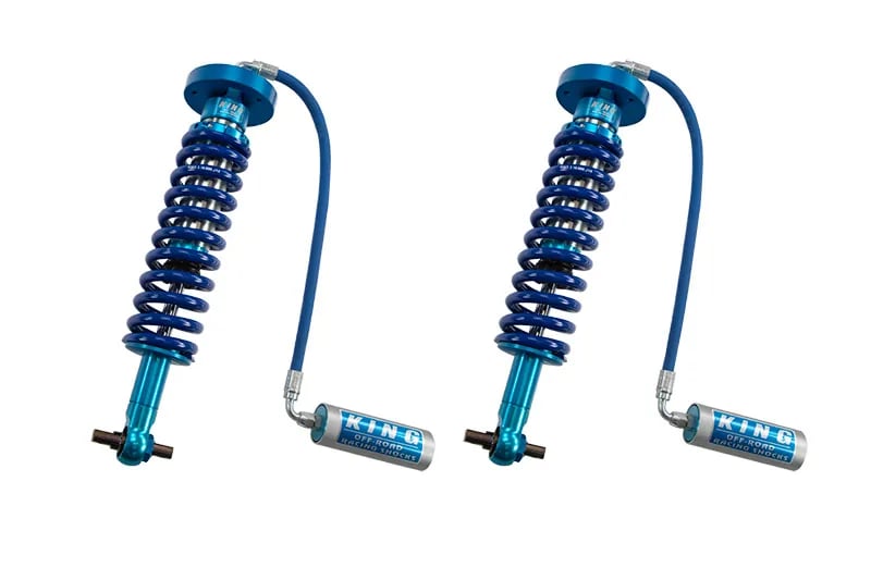 King’s front coilovers feature heavy-duty construction with an off-road racing inspired internal design that is then topped off with remote-mounted reservoirs to maximize your F150’s off-road performance. The coilovers are each built around a 2.5″ diameter shock body that are precision bored and honed with an internal cadmium plating that provides a nearly flawless sealing surface for the valves and piston. The coilovers feature 7/8″ diameter shafts and 6061 aluminum pistons that provide incredible reliability. The coilovers have hard anodized 6061 billet aluminum mounts with spherical bearings that reduce deflection for maximum control. The remote reservoirs fitted to each coilover are made out of hard anodized 6063 billet aluminum and use high-quality fittings and pinch-resistant hoses to ensure reliable operation. Each set of King coilovers includes mounting hardware for the reservoirs and are designed to bolt-on right in place of your factory struts and coil springs.